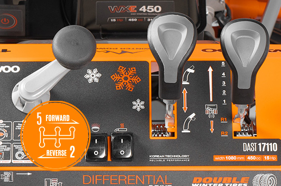 Система обеспечивает выбор скоростей: 5 скоростей вперед и 2 скорости назад, в зависимости от высоты снежного покрова. Простая и одновременно надежная система перемещения фрикционного диска для изменения скорости.