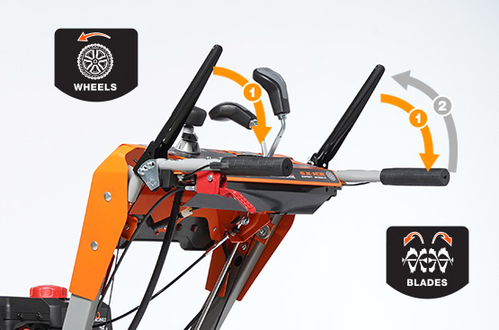 При зажатии обеих рукояток происходит их взаимная блокировка. Это позволяет управлять снегоуборщиком даже одной рукой, в том числе изменять направление выброса снега без остановки работы.